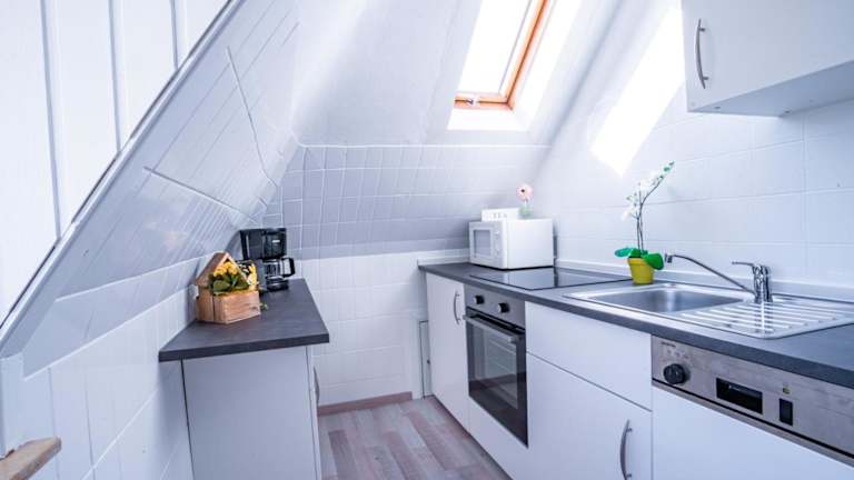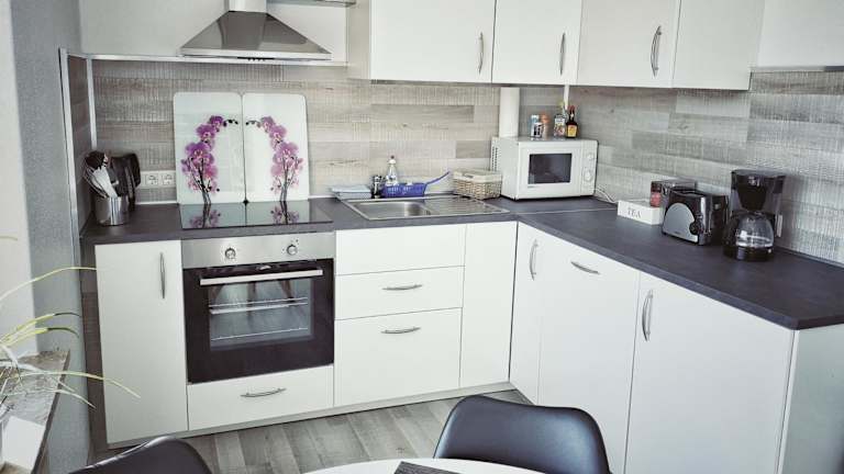 Die Ferienwohnung ist mit einer voll ausgestatteten Küche ausgestattet, die einen Kühlschrank, Geschirrspüler, Ofen, Mikrowelle, Herdplatte und Toaster beinhaltet. Zudem stehen eine Kaffeemaschine und ein Wasserkocher zur Verfügung. Es sind keine Verpflegungsmöglichkeiten vor Ort erwähnt.