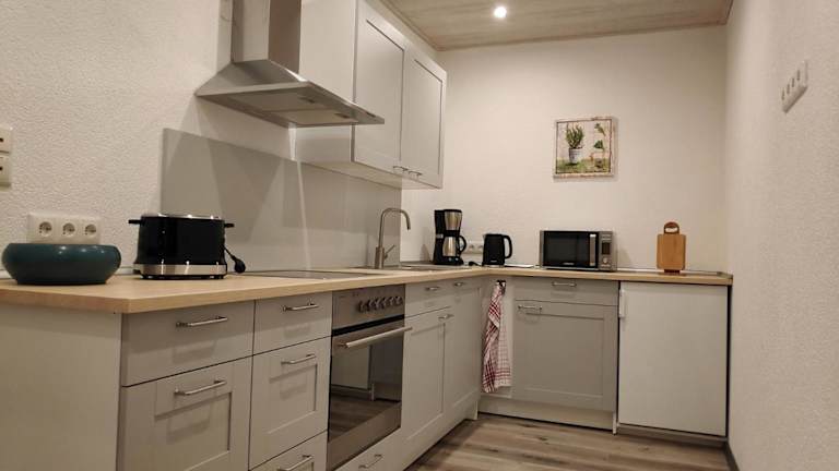 Die Ferienwohnung besteht aus einem Schlafzimmer, einem Wohnzimmer und einer voll ausgestatteten Küche. Zu den Ausstattung gehören ein Kühlschrank, eine Kaffeemaschine und ein Badezimmer mit Dusche. Handtücher und Bettwäsche werden bereitgestellt.