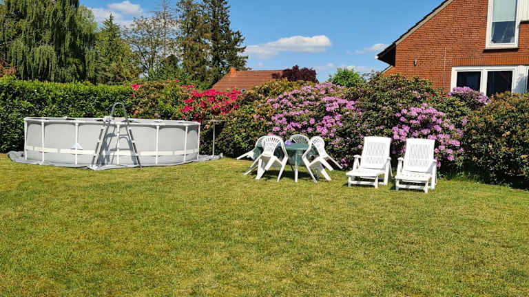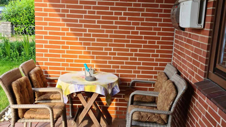 Die Ferienwohnung verfügt über zwei Schlafzimmer, ein Badezimmer mit Dusche und Badewanne, sowie ein Wohnzimmer mit Sitz- und Essbereich. Weiterhin stehen ein Blu-ray-Player, Handtücher und Bettwäsche bereit. Die Überraschungsbequemlichkeit und der Gartenblick bieten eine heimelige Atmosphäre.