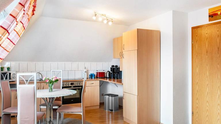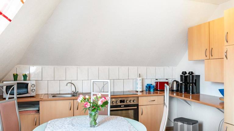 Eine voll ausgestattete Küche mit Kühlschrank und Kaffeemaschine ermöglicht die Zubereitung eigener Mahlzeiten. Es gibt zudem Grillmöglichkeiten im Garten der Unterkunft.