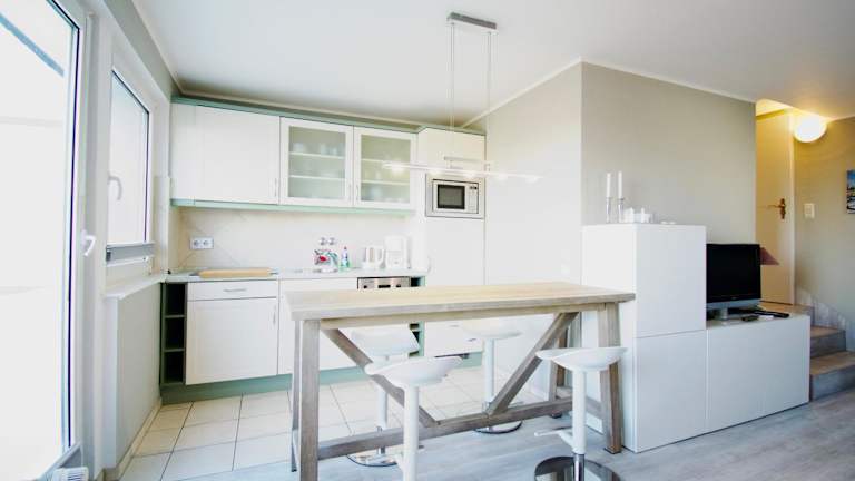 Die Ferienwohnung ist mit einer gut ausgestatteten Küche ausgestattet, die einen Kühlschrank und einen Geschirrspüler umfasst, was eine Selbstverpflegung ermöglicht. Es sind zahlreiche Einkaufsmöglichkeiten in der Nähe, um frische Lebensmittel für die Zubereitung eigener Mahlzeiten zu erwerben.