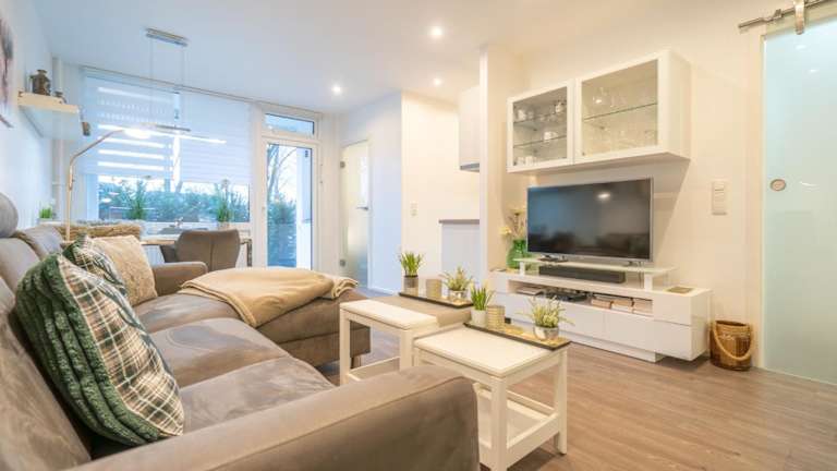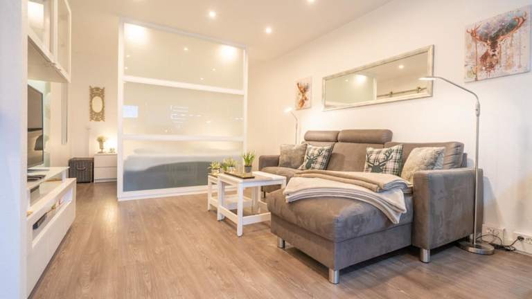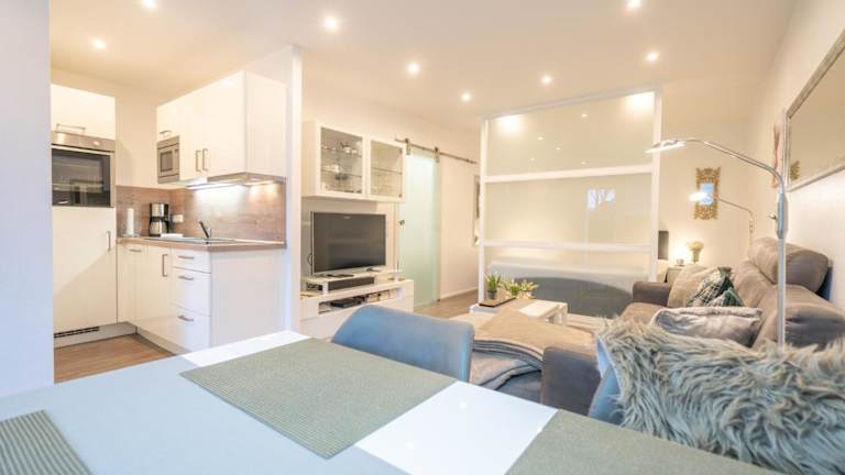 Die Ferienwohnung verfügt über zwei Schlafzimmer sowie eine voll ausgestattete Küche. Zur Ausstattung gehören ein Flachbild-TV und ein Balkon, der direkten Zugang bietet. WLAN steht in allen Bereichen kostenfrei zur Verfügung.
