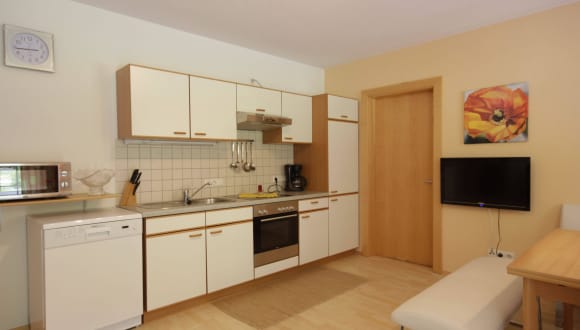 Komfortable Ferienwohnung für 2 bis 6 Personen (60 m²) Die Familienfreundliche Wohnung mit separatem Eingang besteht aus 2 getrennten Schlafzimmern mit Bettwäsche, einer großen Wohnküche mit Ausziehcouch, SAT-TV und Internetanschluss, einem Badezimmer mit Dusche, Hand und Badetüchern sowie einem separaten WC. Die Küche ist ausgestattet mit Cerankochfeld, Backrohr, Mikrowelle, Kühlschrank mit Gefrierfach,Geschirrspüler, Wasserkocher, Kaffemaschine, Geschirr und Geschirrtücher.... In der gesamten Wohnung sind Holz und Fliesenböden. Pavillon mit Liegewiese und Grillplatz sowie Parkplatz direkt beim Haus. Die Haltestelle des Ski – und Wanderbus ist nur ca. 200 m vom Haus entfernt