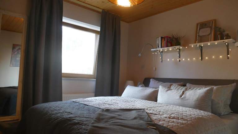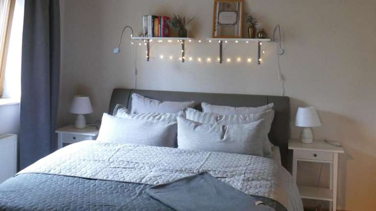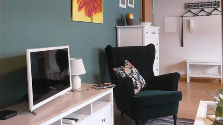Die Ferienwohnung verfügt über ein Schlafzimmer, ein Badezimmer mit Dusche sowie eine gut ausgestattete Küche mit Kühlschrank und Geschirrspüler. Zusätzlich ist ein Flachbild-TV mit Kabelkanälen vorhanden. Handtücher und Bettwäsche werden bereitgestellt.