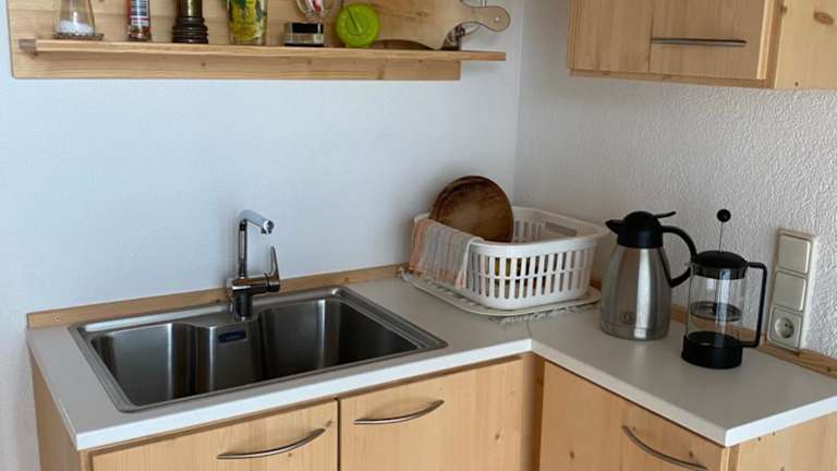 Die Ferienwohnung bietet ein Schlafzimmer, ein Wohnzimmer und eine gut ausgestattete Küchenzeile. Sie ist komfortabel ausgestattet und ermöglicht den Gästen einen schönen Ausblick auf den Garten.