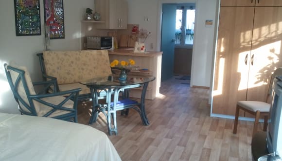 Die Wohnung hat einen kleinen Flur, ein Wohn- und Schlafbereich mit einem Doppelbett und integrierter Küchenzeile. Die Aufstellung eines Gästebettes für eine 3. Person ist möglich. Das Bad hat ein großes Fenster mit Badmöbel, Dusche Waschbecken und WC.