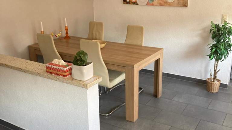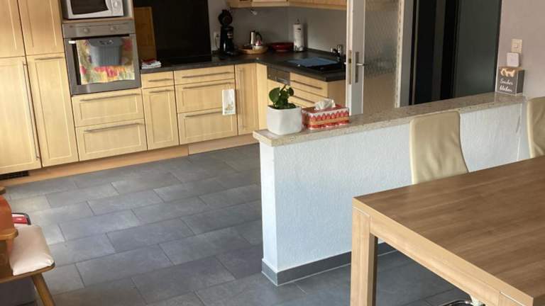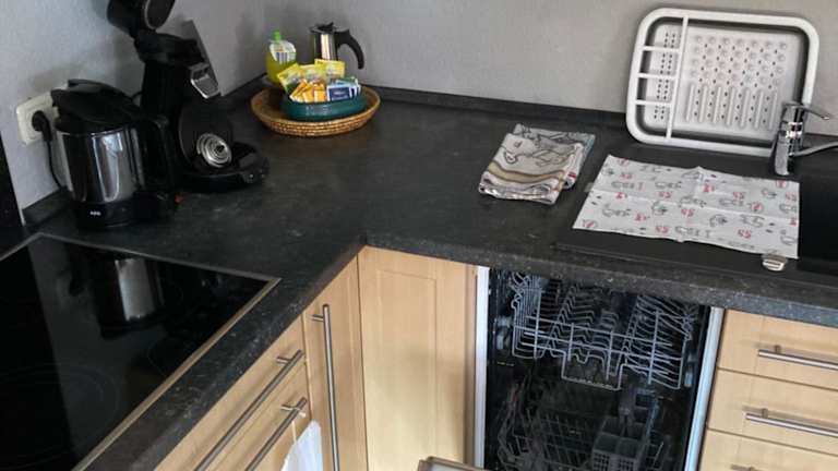 Die Ferienwohnung verfügt über eine gut ausgestattete Küche mit Kühlschrank, Geschirrspüler und Ofen. Ein Sitz- und Essbereich im Wohnzimmer lädt zum gemeinsamen Essen ein.