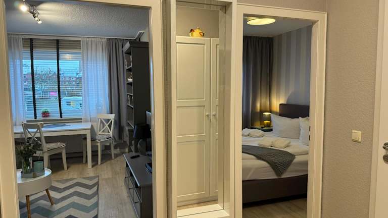 Die Ferienwohnung umfasst ein Schlafzimmer, ein Wohnzimmer sowie eine gut ausgestattete Küche mit Kühlschrank und Ofen. Handtücher und Bettwäsche werden bereitgestellt, und die Unterkunft bietet zudem einen Balkon.