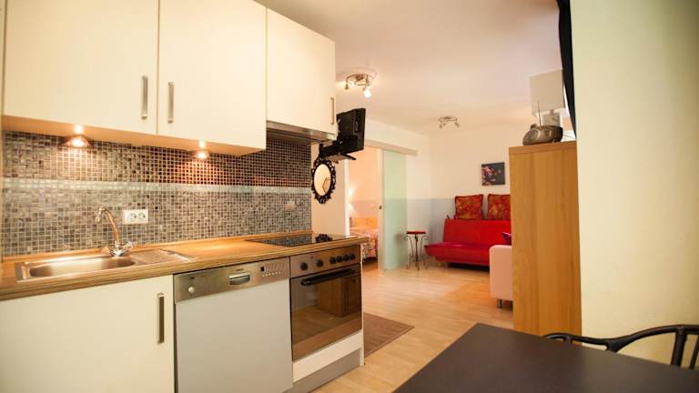 Die Ferienwohnung bietet ein Schlafzimmer, ein Badezimmer, Bettwäsche und Handtücher. Die Ausstattung umfasst zudem einen Flachbild-TV, einen Essbereich, eine voll ausgestattete Küche und einen Balkon mit Bergblick.