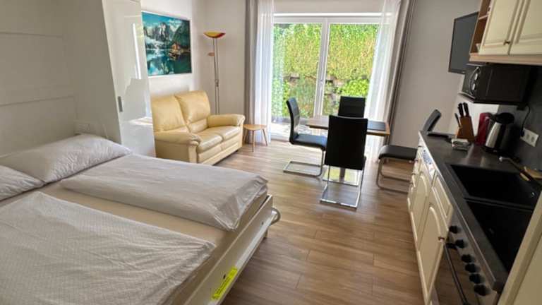 Die voll ausgestattete Küche der Ferienwohnung Imbach beinhaltet Kühlschrank, Geschirrspüler, Ofen, Mikrowelle, Herdplatte, Kaffeemaschine und Wasserkocher, was es den Gästen ermöglicht, ihre Mahlzeiten selbst zuzubereiten. Es sind keine Verpflegungsmöglichkeiten wie Restaurants oder Frühstück aufgeführt.