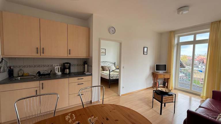 Die Ferienwohnung umfasst eine voll ausgestattete Küche mit Kühlschrank und Kaffeemaschine, jedoch gibt es keine weiteren Informationen zu Verpflegungsmöglichkeiten.