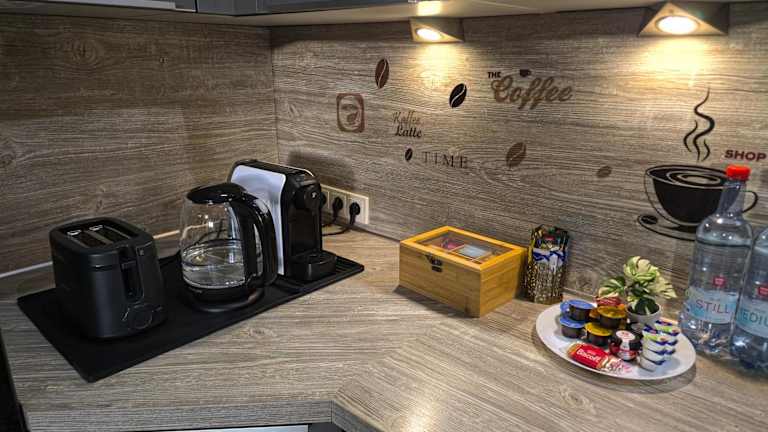 Die Unterkunft verfügt über eine voll ausgestattete Küchenzeile mit Kühlschrank und Kaffeemaschine, jedoch sind keine spezifischen Verpflegungsangebote beschrieben.