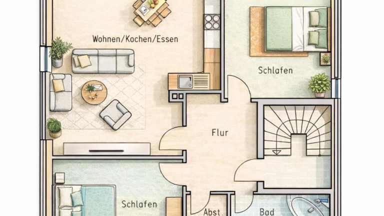 Die Ferienwohnung umfasst zwei Schlafzimmer, ein Wohnzimmer, ein Badezimmer mit Dusche und Haartrockner sowie eine voll ausgestattete Küchenzeile. Handtücher und Bettwäsche werden bereitgestellt.