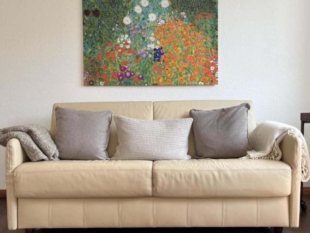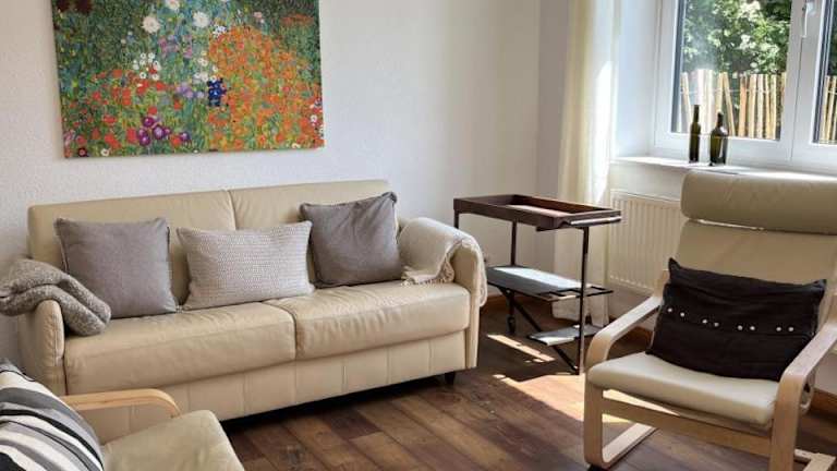 Die Ferienwohnung bietet ein Schlafzimmer, ein Wohnzimmer und eine voll ausgestattete Küchenzeile mit Kühlschrank und Kaffeemaschine. Zur Ausstattung gehört zudem ein Badezimmer mit Badewanne und Haartrockner sowie ein Fernseher mit Kabelkanälen.
