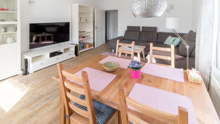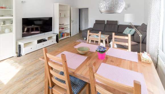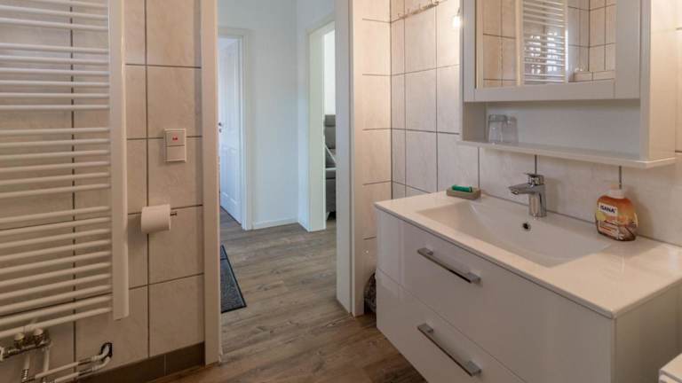 Die Ferienwohnung ist mit zwei Schlafzimmern ausgestattet und bietet ein Wohnzimmer mit einem TV. Zudem gibt es eine voll ausgestattete Küchenzeile mit einem Kühlschrank und einem Geschirrspüler. Das moderne Badezimmer verfügt über eine Dusche.