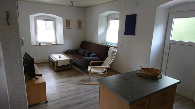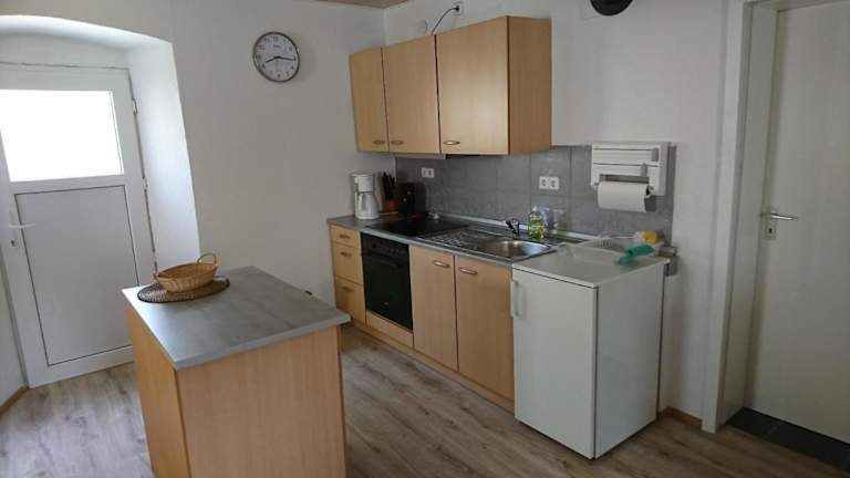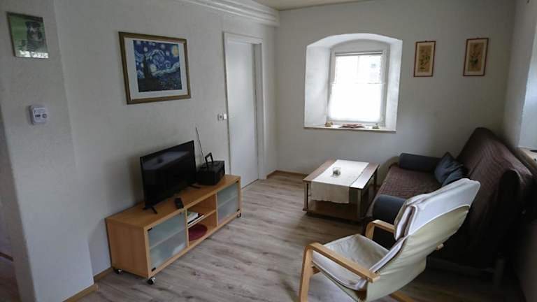 Die Ferienwohnung besteht aus einem Schlafzimmer, einem Wohnzimmer und einer voll ausgestatteten Küche mit Ofen und Kaffeemaschine. Zudem gibt es ein Badezimmer mit Dusche und Haartrockner. Handtücher und Bettwäsche werden bereitgestellt.