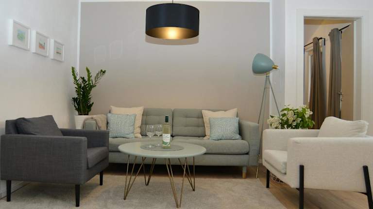 Die Ferienwohnung verfügt über 2 Schlafzimmer, ein Wohnzimmer mit Flachbild-TV, eine gut ausgestattete Küche mit Kühlschrank und Geschirrspüler sowie ein Badezimmer mit Dusche. Handtücher und Bettwäsche werden bereitgestellt.