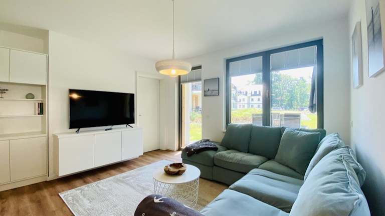 Die Ferienwohnung Inselglück Parkvillen Carlota und Candela Baabe verfügt über eine Terrasse und bietet Übernachtungsmöglichkeiten mit kostenlosem Wifi und Blick auf den Garten. Die Unterkunft ist im Erdgeschoss gelegen und bietet eine gemütliche Atmosphäre.