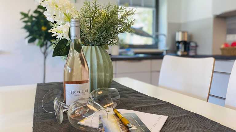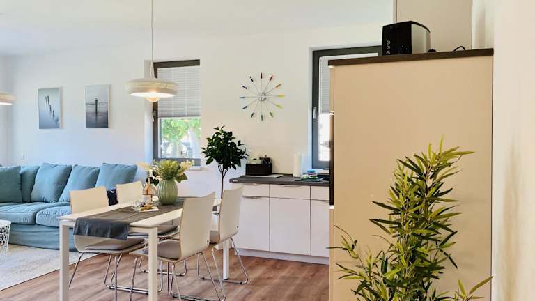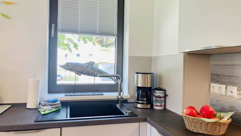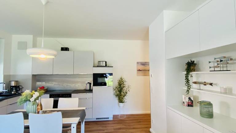 Die Ferienwohnung ist mit einer voll ausgestatteten Küche ausgestattet, die Kühlschrank, Geschirrspüler, Waschmaschine, Ofen sowie Mikrowelle umfasst. Es sind keine separaten Verpflegungsmöglichkeiten angegeben.