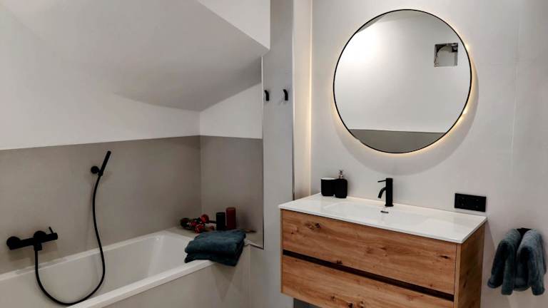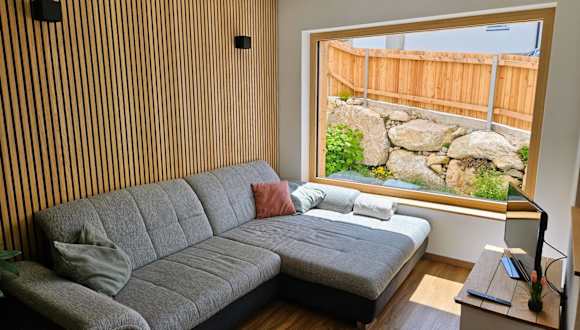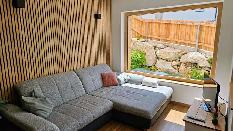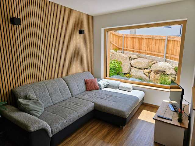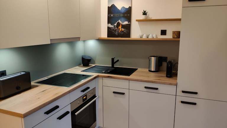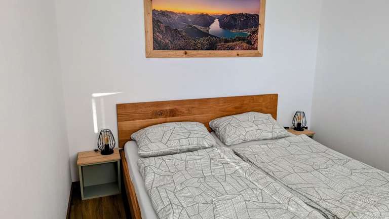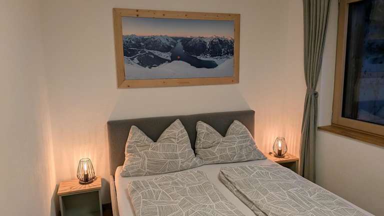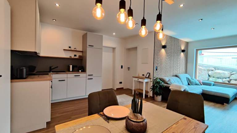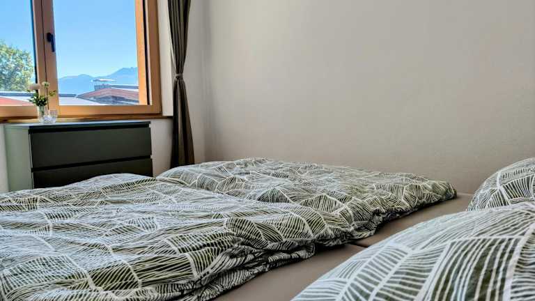 Die Ferienwohnung verfügt über 2 Schlafzimmer, ein Wohnzimmer mit TV sowie eine gut ausgestattete Küche mit Kühlschrank und Geschirrspüler. Zudem gibt es ein Badezimmer mit einer Dusche. Zur Ausstattung gehören auch Handtücher und Bettwäsche. Auf der Terrasse können die Gäste den Blick auf die Berge geniessen.