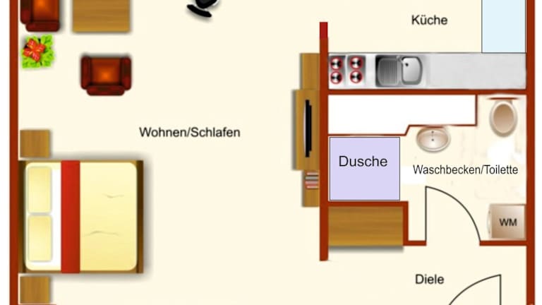 Die Ferienwohnung verfügt über ein Wohnzimmer sowie eine vollständig eingerichtete Küche, die den Gästen die Möglichkeit gibt, selbst zu kochen und sich bei Bedarf zu verpflegen.