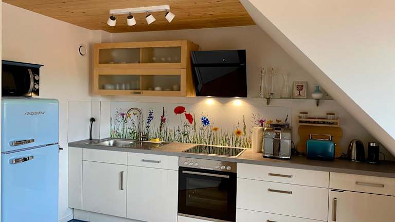 Die Ferienwohnung umfasst 1 Schlafzimmer, ein Wohnzimmer und eine voll ausgestattete Küchenzeile mit Kühlschrank und Kaffeemaschine. Das Badezimmer verfügt über eine Dusche und einen Haartrockner. Handtücher und Bettwäsche werden bereitgestellt. Die Terrasse lädt dazu ein, die frische Luft zu geniessen.