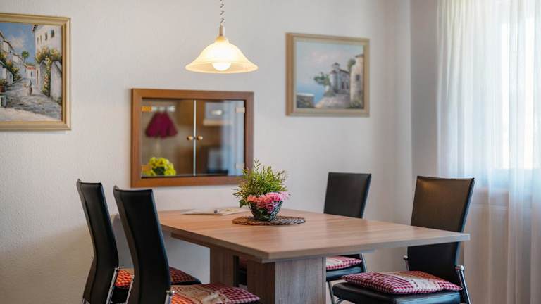 Die Ferienwohnung Karin ist eine moderne Unterkunft mit zwei Schlafzimmern und zwei Badezimmern. Die Wohnung ist ausgestattet mit Bettwäsche, Handtüchern, einem TV mit Satellitenkanälen, sowie einer voll ausgestatteten Küche. Ein Balkon mit Seeblick sorgt für eine angenehme Atmosphäre.