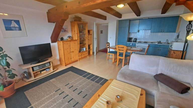 Die Ferienwohnung besteht aus einem Schlafzimmer, einem Wohnzimmer und einer voll ausgestatteten Küchenzeile mit Kühlschrank und Kaffeemaschine. Das Badezimmer ist mit einer Dusche und einem Haartrockner ausgestattet. Bettwäsche und Handtücher können gegen Aufpreis bereitgestellt werden.