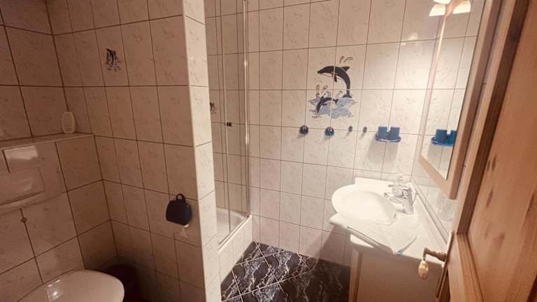 Die Ferienwohnung umfasst ein Schlafzimmer, ein Wohnzimmer und eine voll ausgestattete Küchenzeile mit Kühlschrank und Kaffeemaschine. Das Badezimmer enthält eine Dusche und einen Haartrockner, und ein TV mit Satellitenkanälen sorgt für Unterhaltung.