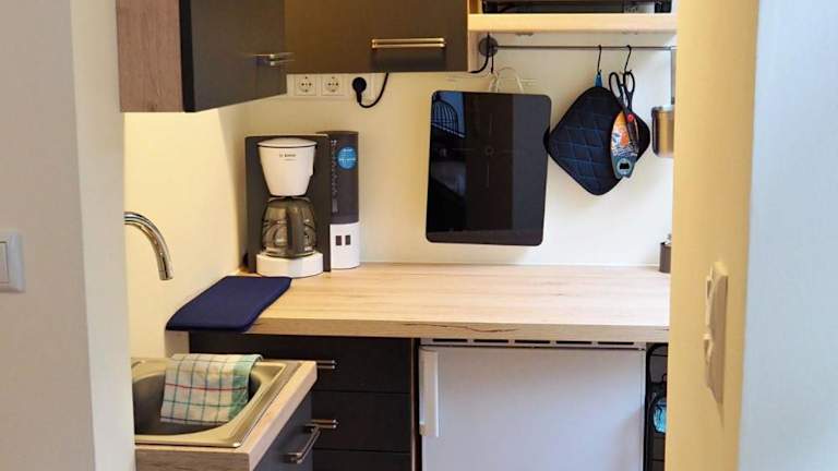 Die Unterkunft verfügt über eine gut ausgestattete Küche mit Kühlschrank, Ofen und Herdplatte sowie einer Kaffeemaschine, was die Zubereitung eigener Mahlzeiten ermöglicht.