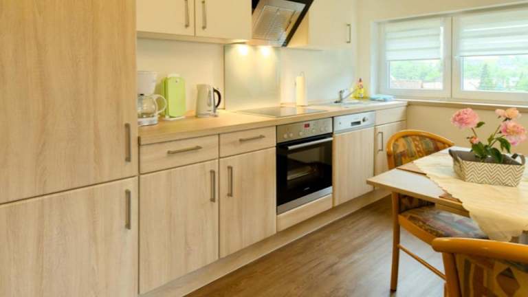 Die Ferienwohnung verfügt über eine voll ausgestattete Küche mit Kühlschrank und Geschirrspüler, wodurch Selbstverpflegung möglich ist. Es sind keine weiteren Informationen zu Verpflegungsmöglichkeiten vorhanden.