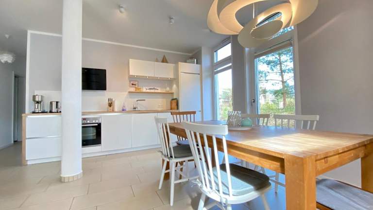 Die Ferienwohnung Koje 2 verfügt über eine gut ausgestattete Küche mit Kühlschrank, Backofen und Geschirrspüler, in der Sie Ihre eigenen Mahlzeiten zubereiten können. Das Wohnzimmer bietet einen gemütlichen Sitzbereich und einen Essbereich, ideal für gemeinsame Mahlzeiten. Die Wohnung verfügt über zwei Schlafzimmer und ein Badezimmer mit Dusche und Badewanne. Zur Unterhaltung stehen Ihnen ein Flachbild-Sat-TV, ein DVD-Player und ein CD-Player zur Verfügung. Ein Blu-ray-Player ist ebenfalls vorhanden.