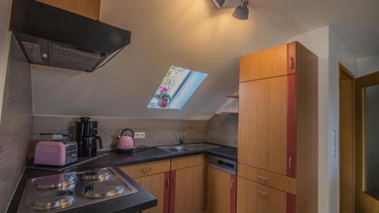 Die Ferienwohnung beinhaltet eine Küchenzeile mit einem Kühlschrank und einem Geschirrspüler, sodass Gäste die Möglichkeit haben, selbst zu kochen und die Speisen in der heimeligen Umgebung zu geniessen. Es werden auch Handtücher und Bettwäsche zur Verfügung gestellt.