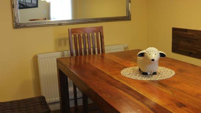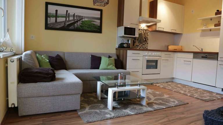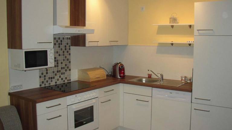 Die Ferienwohnung verfügt über zwei Schlafzimmer, ein Wohnzimmer mit Flachbild-TV, eine gut ausgestattete Küche mit Kühlschrank und Geschirrspüler sowie ein Badezimmer mit Dusche. Ein Balkon mit Bergblick rundet die Ausstattung ab. Handtücher und Bettwäsche werden bereitgestellt und der Zugang zur Unterkunft erfolgt über einen Schlüssel.