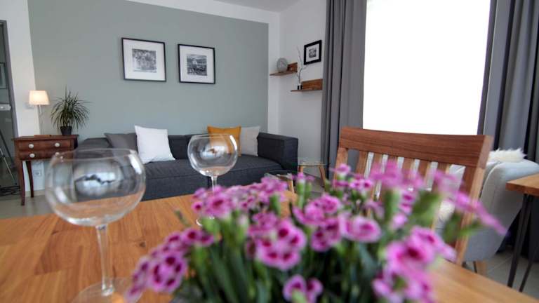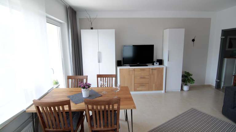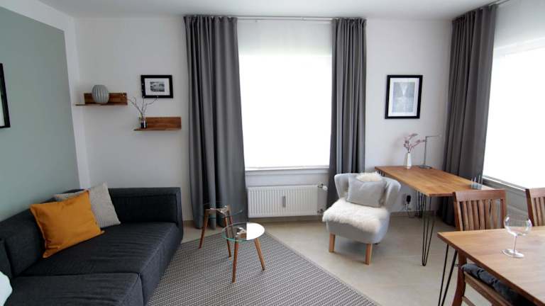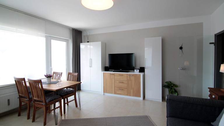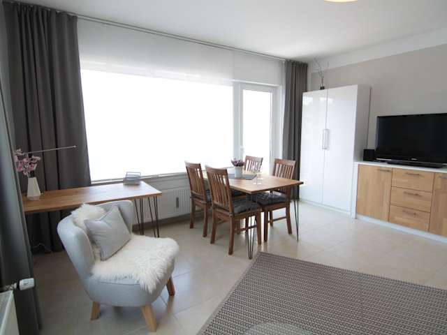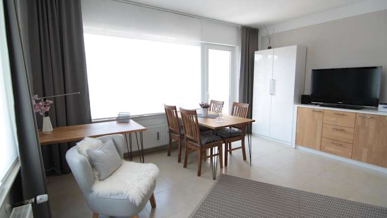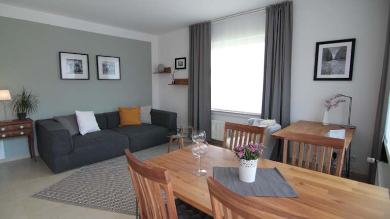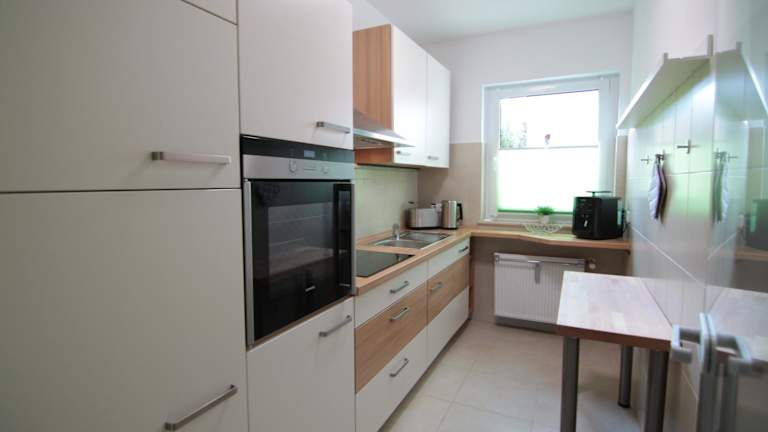 Die Ferienwohnung besteht aus 1 Schlafzimmer, einem Wohnzimmer und einer voll ausgestatteten Küche mit Kühlschrank und Kaffeemaschine. Ein Badezimmer mit Dusche rundet die Ausstattung ab.