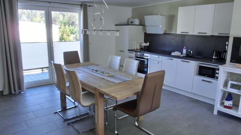 Die Ferienwohnung verfügt über eine voll ausgestattete Küche, die den Gästen die Möglichkeit bietet, eigene Mahlzeiten zuzubereiten. Ein Kühlschrank, ein Geschirrspüler, eine Waschmaschine, ein Ofen und eine Mikrowelle sind vorhanden.
