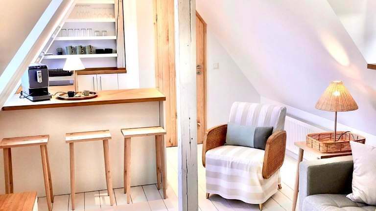 Die Unterkunft verfügt über eine voll ausgestattete Küche mit einem Esstisch. Gästen stehen ein Kühlschrank, ein Geschirrspüler, ein Ofen, eine Kaffeemaschine sowie ein Wasserkocher zur Verfügung.