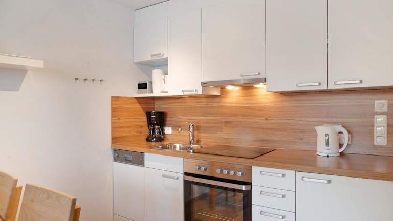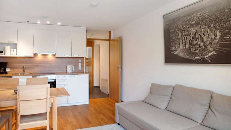 Die Ferienwohnung verfügt über ein Schlafzimmer und ein Badezimmer. Zur Ausstattung gehören Bettwäsche, Handtücher, ein TV mit Satellitenkanälen sowie eine voll ausgestattete Küche. Ein Balkon mit Blick auf die Berge sorgt für eine entspannende Atmosphäre.