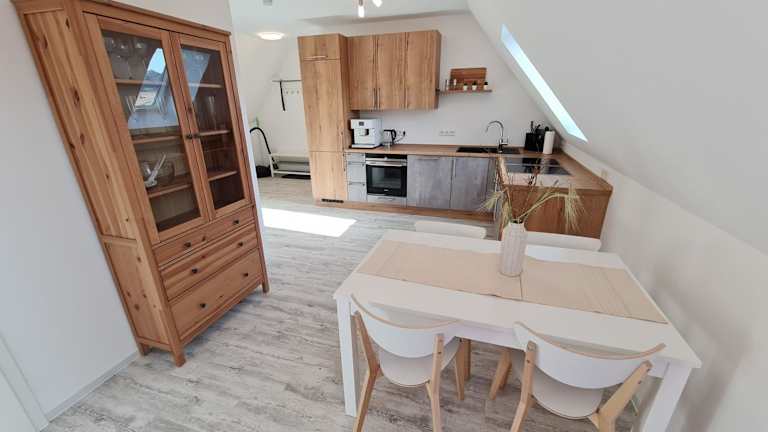 Die Ferienwohnung verfügt über eine voll ausgestattete Küche mit einem Kühlschrank und einer Kaffeemaschine. Es sind keine spezifischen Angaben zu Verpflegungsmöglichkeiten vorhanden.