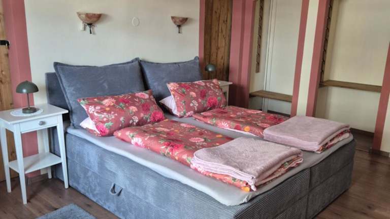 Die Ferienwohnung verfügt über ein Schlafzimmer, ein Wohnzimmer sowie eine voll ausgestattete Küche mit Kühlschrank und Kaffeemaschine. Ein Badezimmer mit Dusche und Haartrockner ist ebenfalls vorhanden. Handtücher und Bettwäsche werden bereitgestellt.