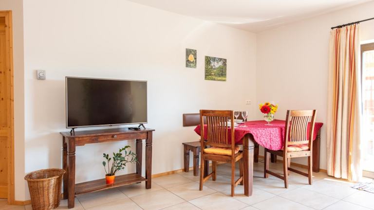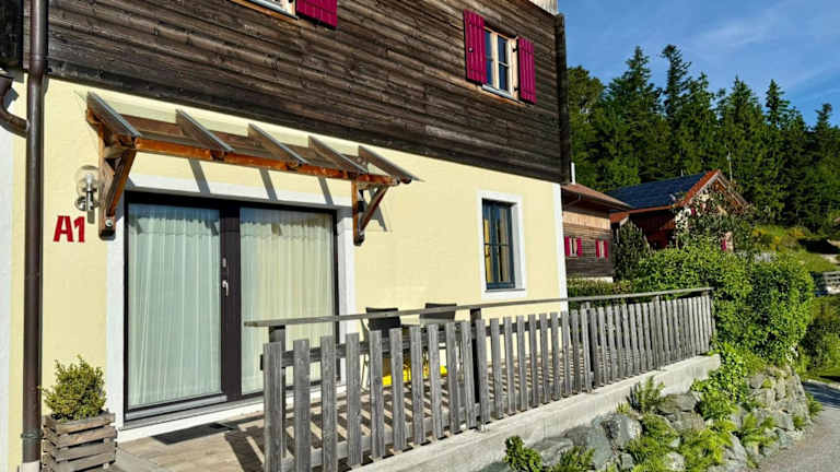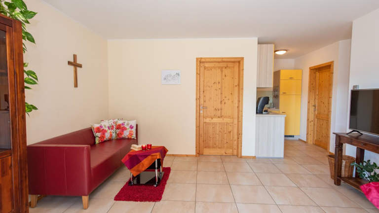 Die Ferienwohnung verfügt über ein Schlafzimmer und ein Wohnzimmer. Die Ausstattung umfasst einen Flachbild-TV, eine gut ausgestattete Küche mit Kühlschrank und Geschirrspüler sowie ein Badezimmer mit Dusche. Handtücher und Bettwäsche werden bereitgestellt. Zudem gibt es eine Terrasse mit Bergblick.