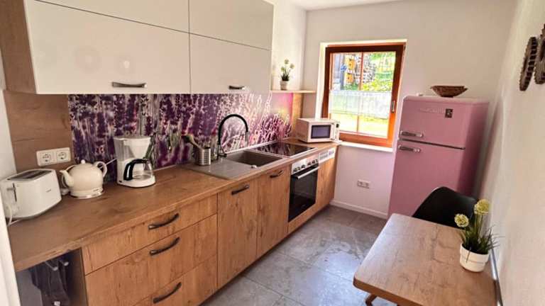 Die Ferienwohnung verfügt über eine voll ausgestattete Küche mit Kühlschrank und Kaffeemaschine, die eine Selbstverpflegung ermöglichen. Es sind keine Informationen über Verpflegungsmöglichkeiten vorhanden.