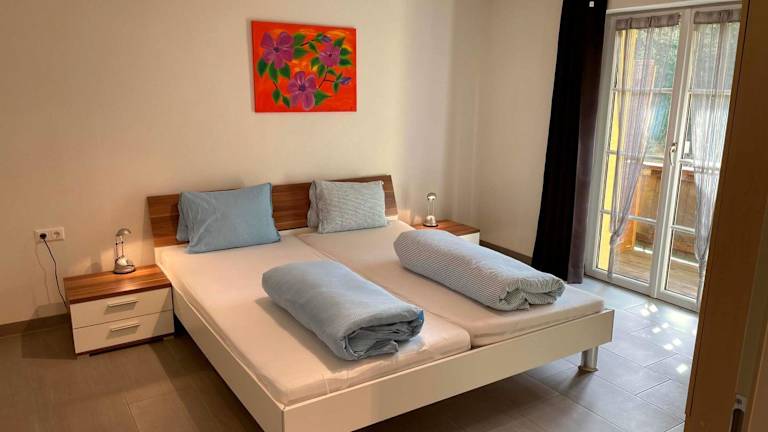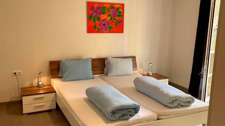 Die Ferienwohnung verfügt über ein Schlafzimmer, ein Wohnzimmer mit einem Flachbild-TV, eine gut ausgestattete Küche mit Kühlschrank und Geschirrspüler sowie ein Badezimmer mit Dusche. Zudem bietet die Unterkunft einen Balkon mit Blick auf die Berge.