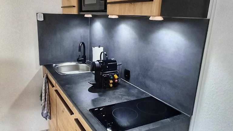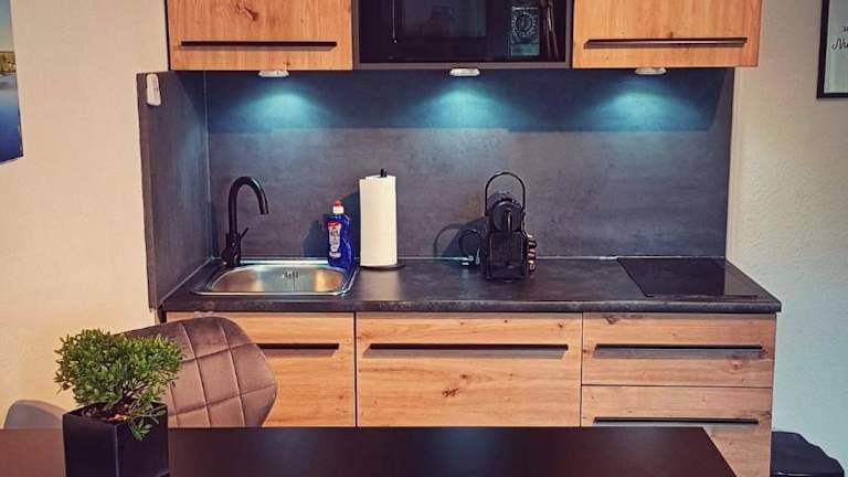 Die Ferienwohnung beinhaltet eine voll ausgestattete Küche mit Kühlschrank, Geschirrspüler, Waschmaschine, Mikrowelle und Herdplatte. Es sind keine Informationen zu weiteren Verpflegungsmöglichkeiten vorhanden.