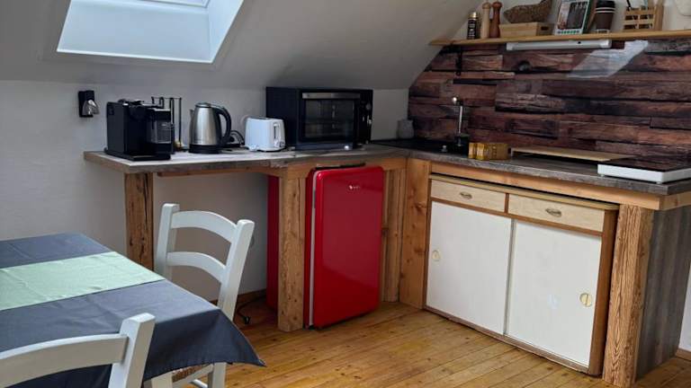 Die Ferienwohnung ist ausgestattet mit einem Schlafzimmer, einem Badezimmer, Bettwäsche, Handtüchern, einem Flachbild-TV, einem Essbereich, einer voll ausgestatteten Küche und einer Terrasse mit herrlichem Bergblick.