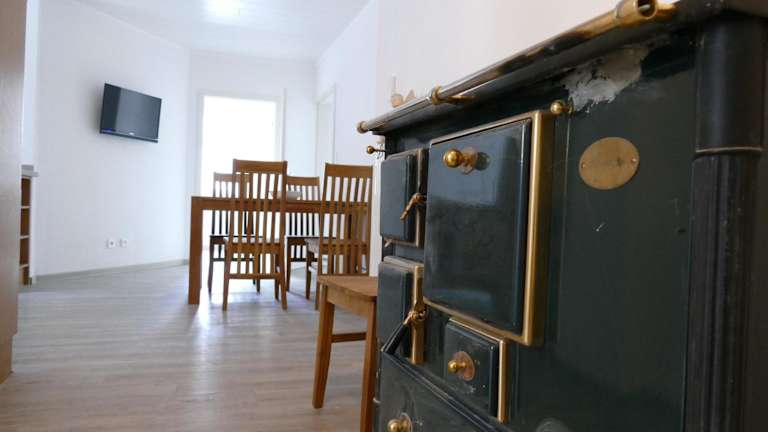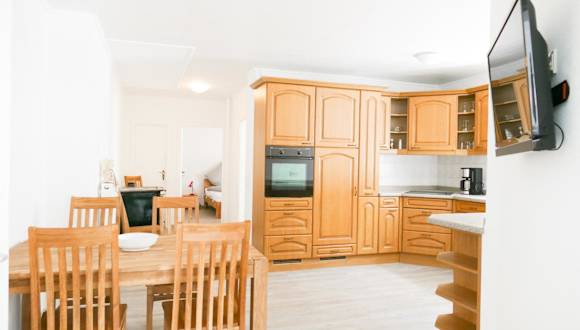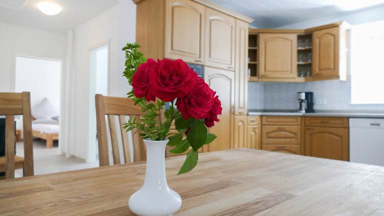 Die Ferienwohnung verfügt über eine voll ausgestattete Küche mit Kühlschrank und Geschirrspüler, was die Selbstversorgung ermöglicht.