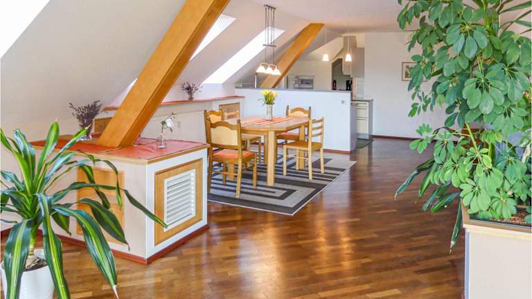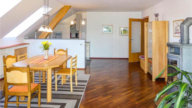 Die Ferienwohnung verfügt über 2 Schlafzimmer, ein Wohnzimmer mit TV und eine gut ausgestattete Küche, die mit einem Kühlschrank und einem Geschirrspüler versehen ist. Zudem gibt es ein Badezimmer mit Dusche. Die ausreichend dimensionierten Räume ermöglichen einen heimeligen Aufenthalt.