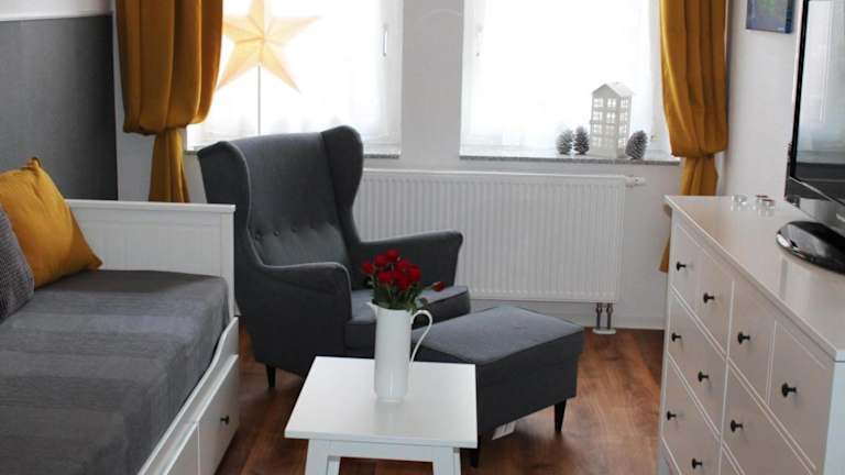 Die Ferienwohnung besteht aus einem Schlafzimmer, einem Wohnzimmer und einer voll ausgestatteten Küche. Diese beinhaltet einen Kühlschrank und eine Kaffeemaschine. Das Badezimmer ist mit einer Badewanne und einem Haartrockner ausgestattet. Handtücher und Bettwäsche werden bereitgestellt.