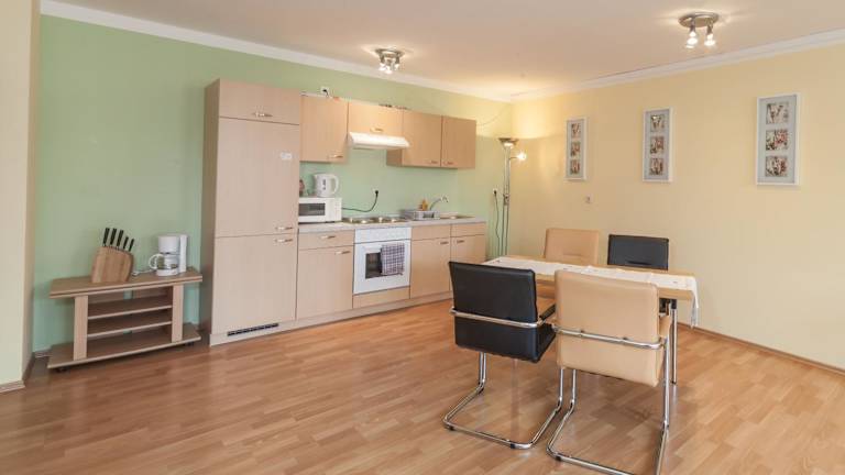 Die Wohneinheiten verfügen über eine voll ausgestattete Küche, in der Gäste selbständig ihre Mahlzeiten zubereiten können. Eine Kaffeemaschine und ein Wasserkocher sind ebenfalls vorhanden.