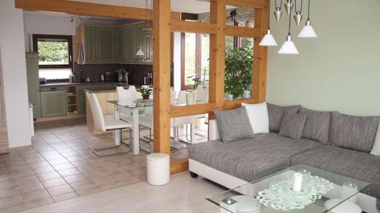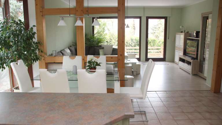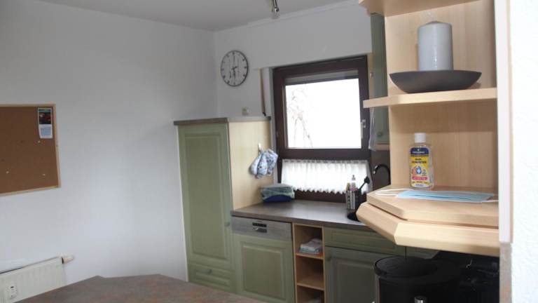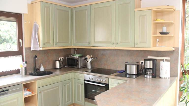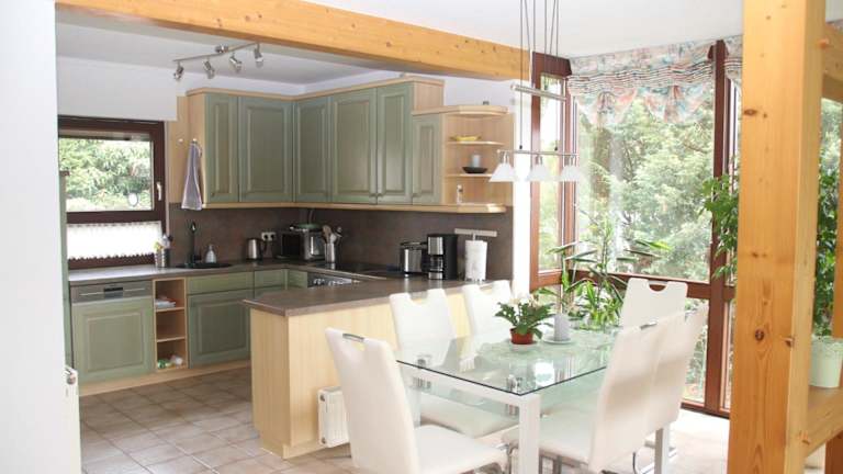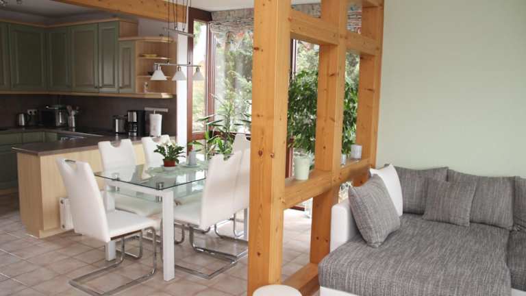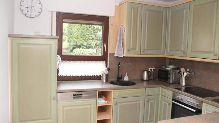 Die Ferienwohnung verfügt über eine voll ausgestattete Küche mit Kühlschrank, Geschirrspüler und Ofen. Es stehen auch ein Essbereich sowie ein gemütlicher Sitzbereich im Wohnzimmer zur Verfügung.